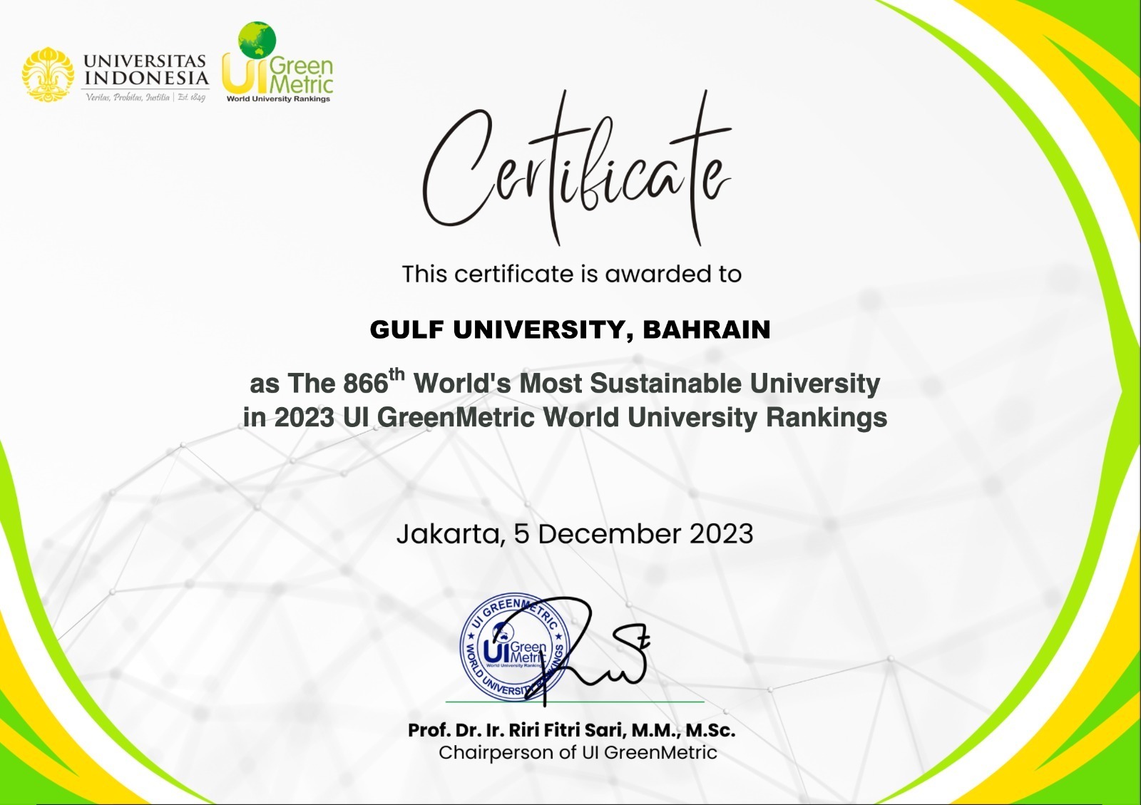 - UI Greenmetric Ranking 2023 – View Certificate